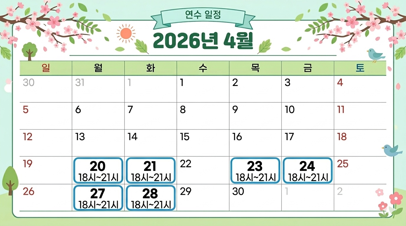 2) 연수 일시: 4. 20.(월), 21.(화), 23.(목), 24.(금), 27.(월), 27.(화) 18:00~21:00